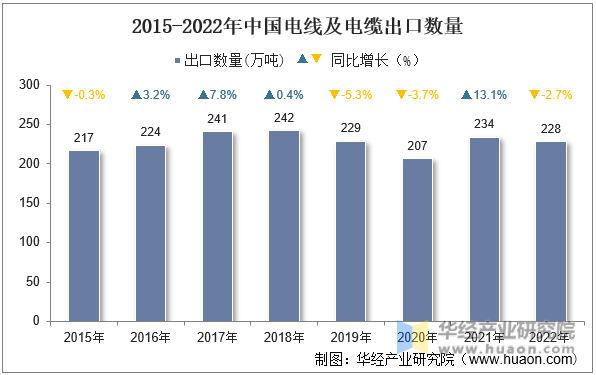 2022年中國電線及電纜出口數(shù)量為228萬噸,相比2021年同期減少了6萬噸,同比下降2.7%。